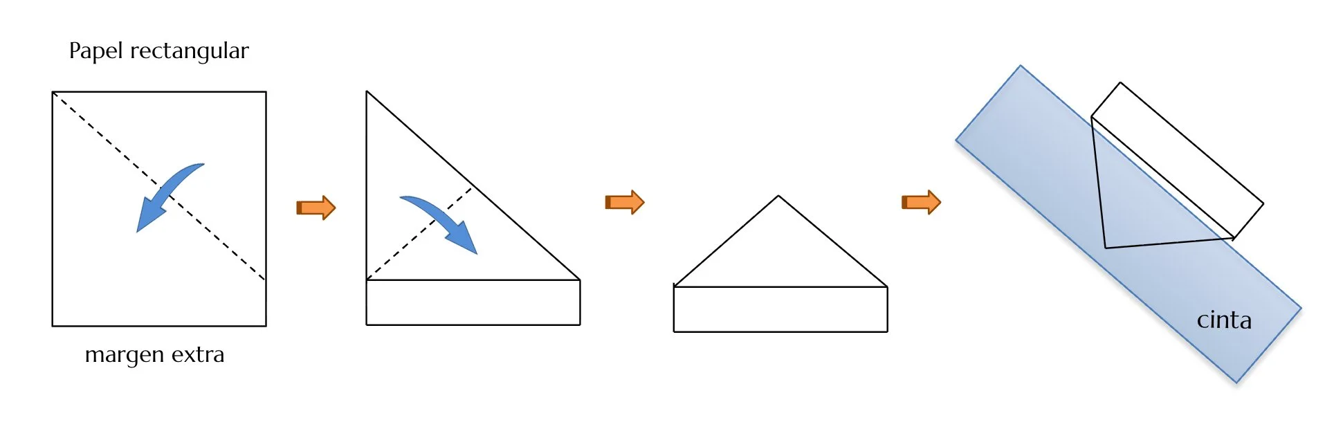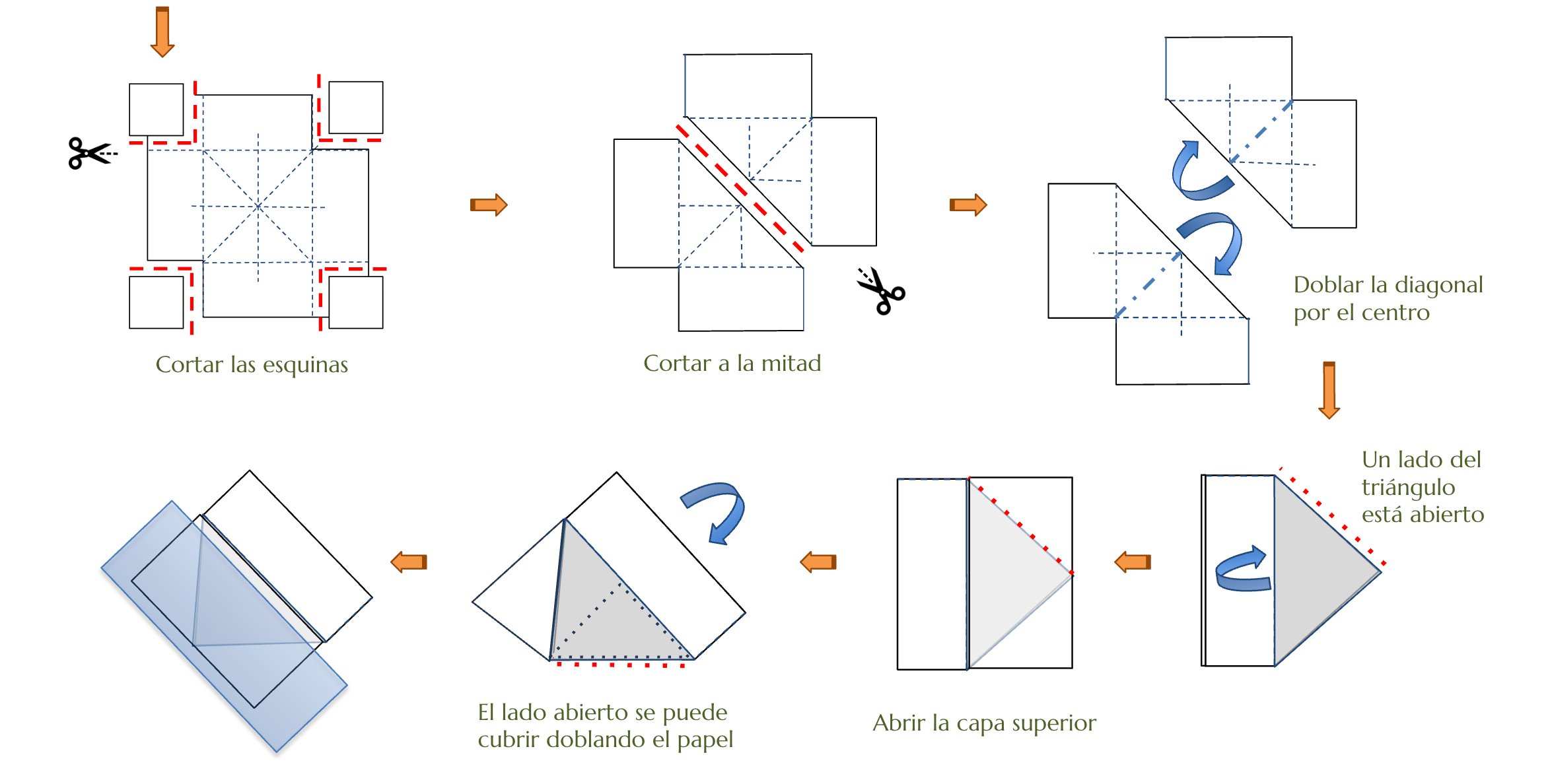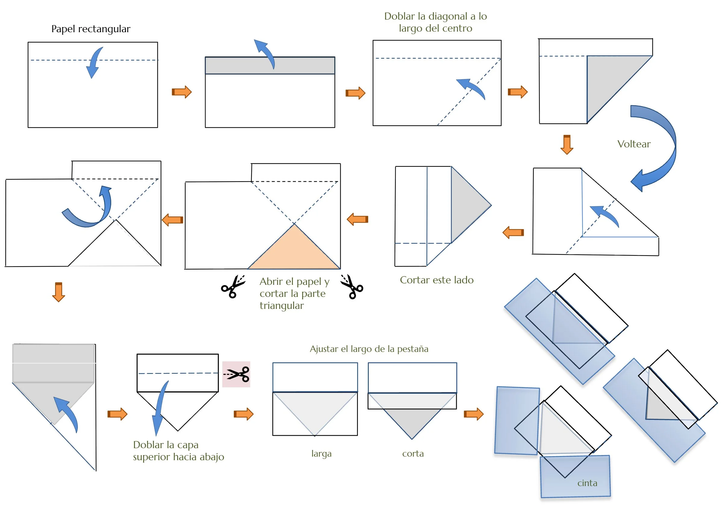 Consejos: si utilizas esquineros con frecuencia, es útil preparar los materiales con anticipación. Corta el papel en distintos tamaños y dóblalo hasta los pasos 3–4 (ver ilustración). También puedes cortar la cinta en las longitudes necesarias.