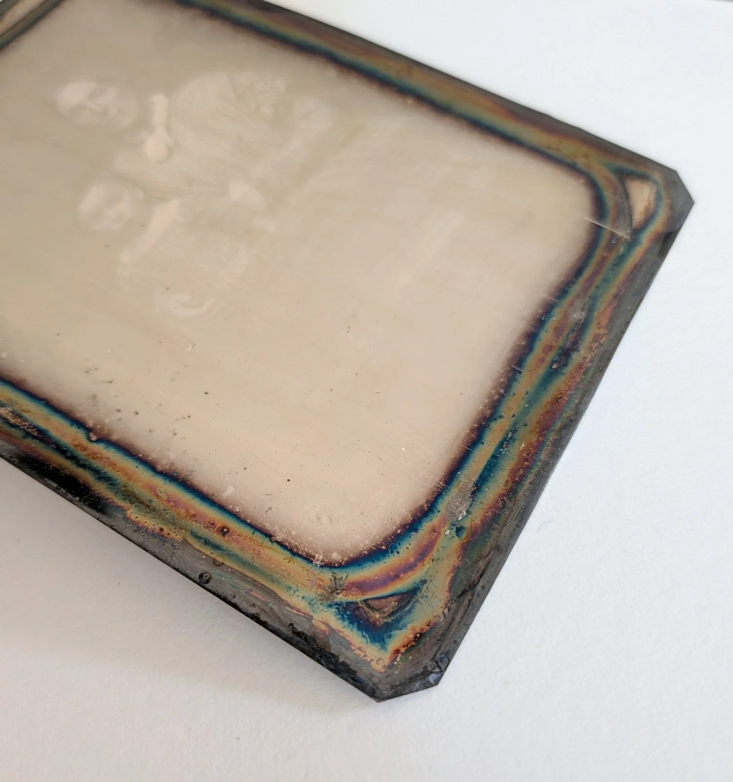 Amarillamiento o decoloración localizada en tonos amarillo-naranja, causada por la oxidación de las partículas de plata catalizado por el dióxido de titanio presente en las impresiones con soporte RC o papel resinado que se encuentran enmarcadas o en ambientes sin ventilación. Ocurre ante exposiciones prolongadas a la luz.